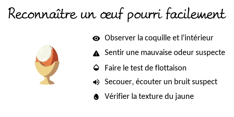 Votre nez est votre meilleur allié pour reconnaître un œuf pourri. L’œuf avarié se reconnaît à son odeur nauséabonde et sulfureuse, proche de celle du soufre ou des œufs pourris classiques. Si, dès que vous cassez l’œuf, une telle odeur se dégage, jetez-le immédiatement.